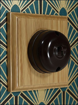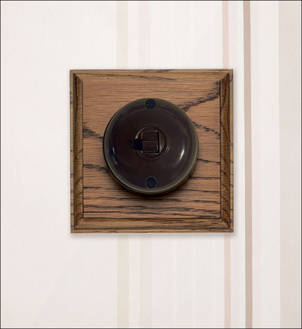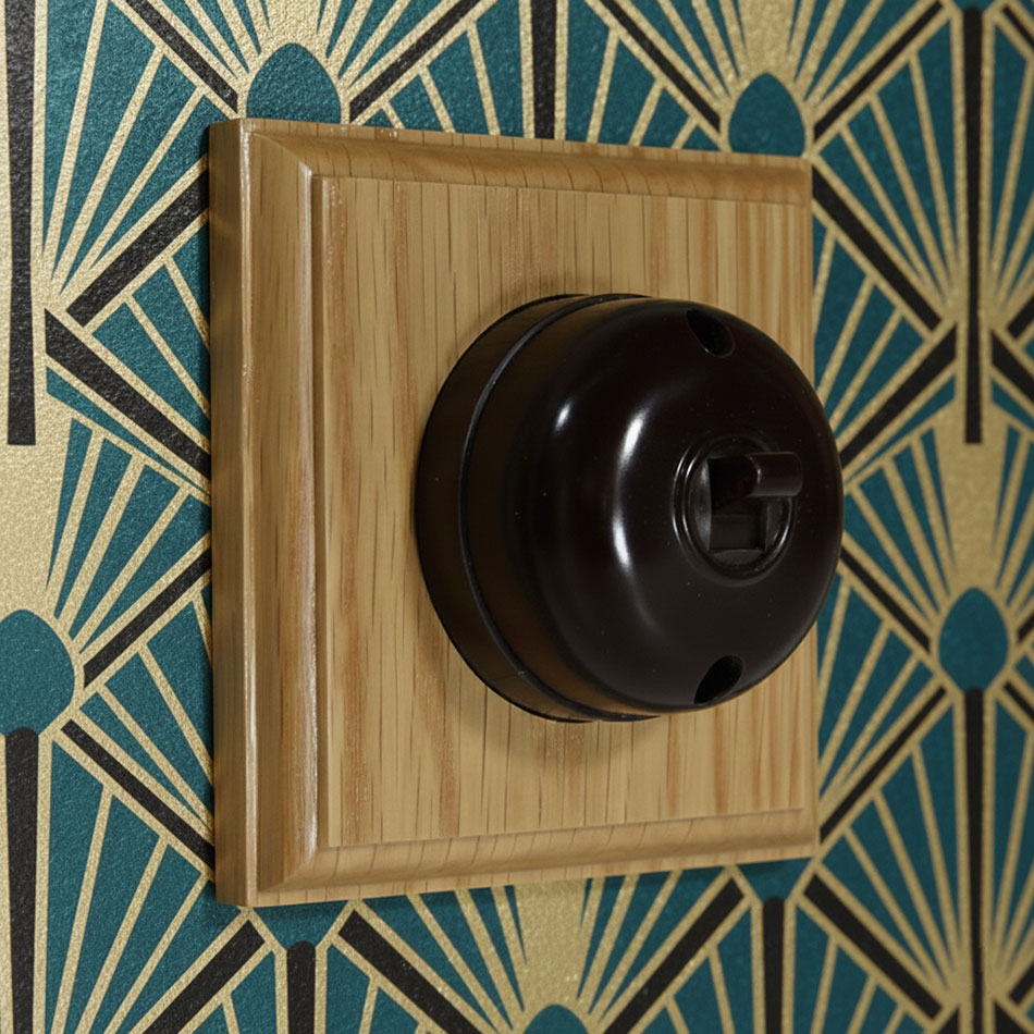 This bakelite light switch with a square oak face plate is designed for period and heritage interiors where modern plastic accessories would feel out of place. The combination of traditional moulded bakelite and real oak creates a timeless look suited to Victorian, Edwardian, Arts & Crafts and country-style properties.