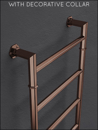 The Art Deco Wall Mounted Copper Heated Towel Rail is suitable for central heating, dual fuel or electric-only installation, making it well suited to both new bathroom projects and renovation work. The well-spaced bars allow towels to hang neatly and dry efficiently, while the structured frame and angular detailing give the design a more architectural feel than a standard ladder rail.