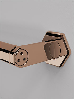 The bar features a straight 32mm diameter with a subtly faceted profile, combined with crisp hexagonal wall brackets to create a clean, geometric Art Deco look. It can be installed horizontally or vertically beside showers, baths and WCs, and can also double as a practical towel rail where space needs to work hard.