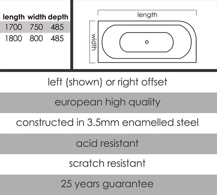 This offset double ended bath is designed for built in corner installation. Each steel bath is manufactured in 3.5mm stove enamelled steel which is highly acid, impact and scratch resistant. White steel baths are stocked but please note coloured baths are supplied to special order.