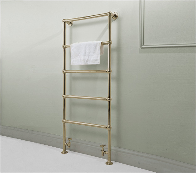 This exclusive natural brass towel rail is a floor mounted design with timeless ball joints, available in a range of sizes.