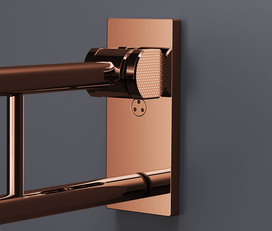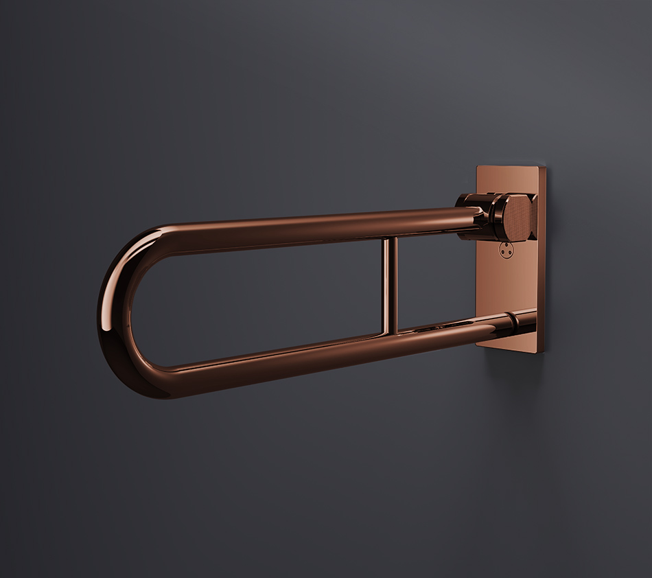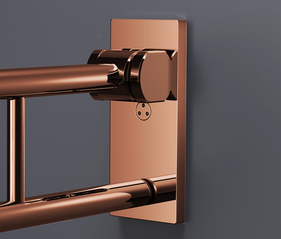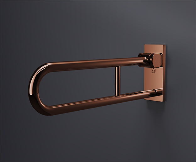 The dual-arm design includes a soft-close, smooth folding hinge that allows the bar to tuck neatly against the wall when not in use, preserving space and maintaining a streamlined appearance.