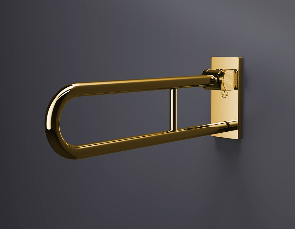 The dual-arm design includes a soft-close, smooth folding hinge that allows the bar to tuck neatly against the wall when not in use, preserving space and maintaining a streamlined appearance.