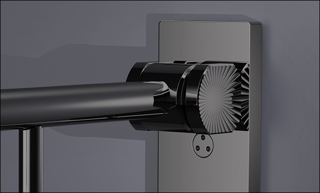 A distinctive radial sunburst detail, precision-machined into the hinge housing, adds a refined feature without overwhelming the clean lines of the twin bars. The double-arm design folds smoothly up or down with a controlled, quiet action thanks to an oil-dampened soft-close hinge, helping keep the area clear when support isnt required.
