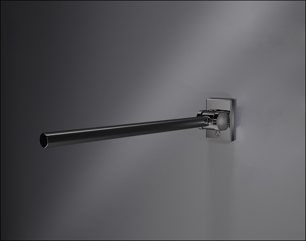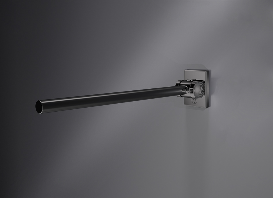 A distinctive radial sunburst detail, precision-machined into the hinge housing, adds a subtle designer feature while keeping the bar itself sleek and minimalist. This single-finger folding grab rail attaches securely when needed and removes easily when not, leaving a discreet cover plate to conceal the wall fixings for a tidy, uncluttered finish.