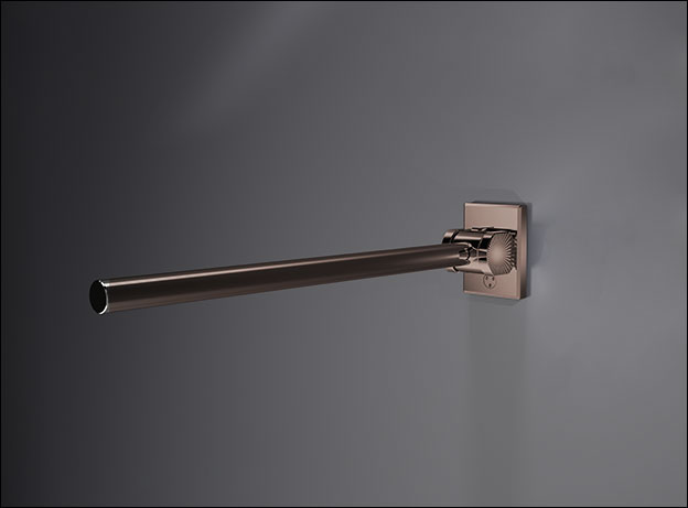 The slim single-finger profile includes a subtle etched detail on the hinge housing, giving the bar a distinctive design feature that works well in contemporary or minimalist interiors. With its durable PVD bronze coating in brushed or polished options, it pairs seamlessly with bronze taps, hardware and luxury bathroom schemes.