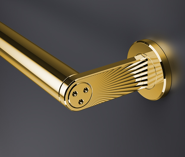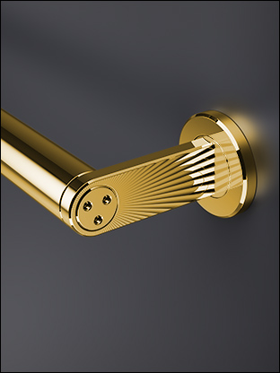 As part of the Helo Collection, this striking T-shaped support features a precision-milled Sunbeam motif etched into the stainless steel surface, creating a modern focal point with added tactile detail.
