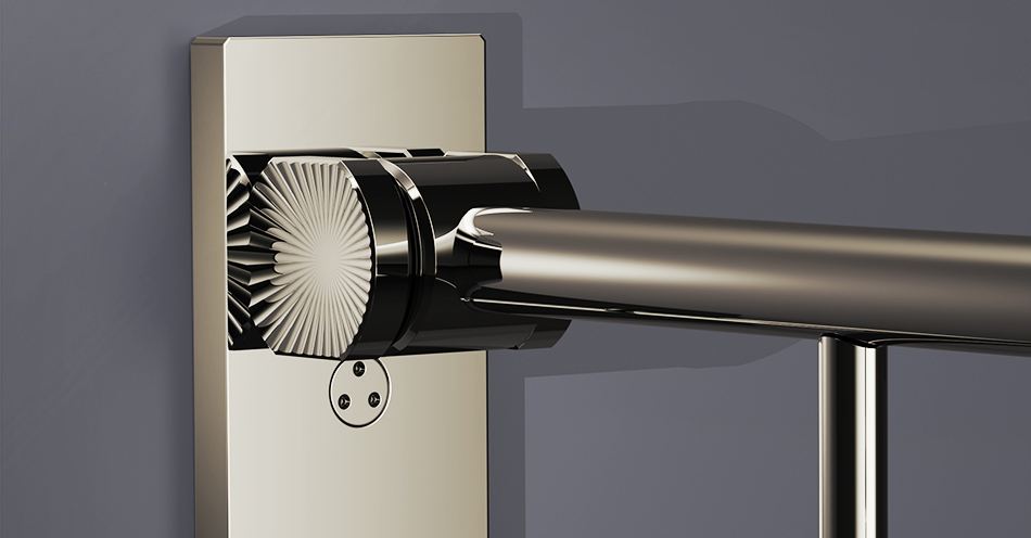 The twin-bar design is finished in a durable PVD nickel coating, available in polished or brushed options to coordinate with classic and modern brassware. A distinctive sunburst detail is precision-machined into the side of the hinge housing, adding a subtle decorative highlight without overpowering the clean lines of the rail. Plain wall plates or matching decorative rosette fixings can be specified to suit the style of the room.