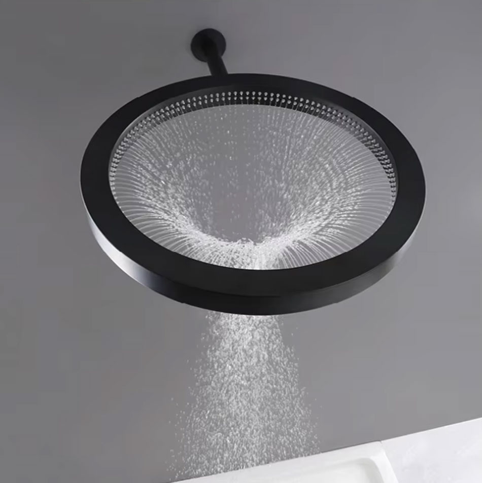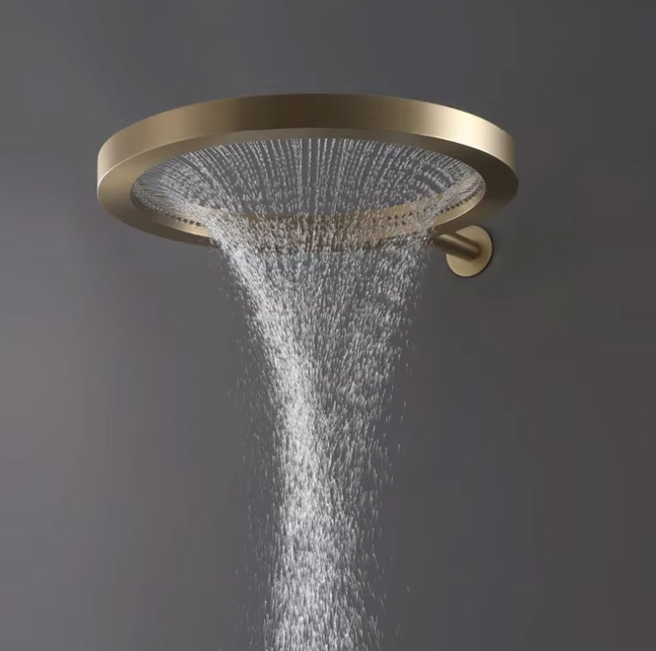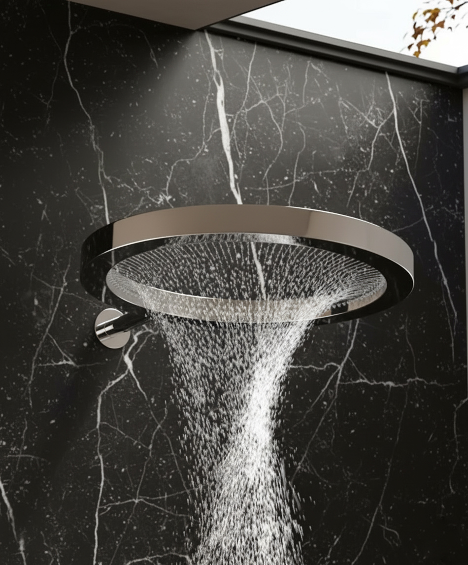 The ultra-slim stainless-steel body keeps the profile light and modern while producing a generous, cone-shaped flow that feels luxurious without overwhelming the space.